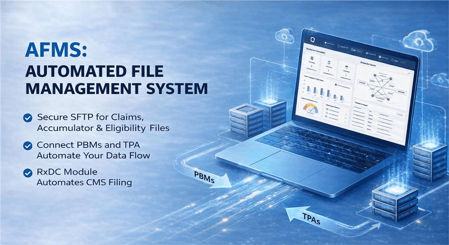 AFMS is an automated file management system that securely handles the intake, validation, and transfer of eligibility, claims, and accumulator files across PBMs, TPAs, and vendors with minimal manual effort. The key benefit is reduced operational risk and faster turnaround times by eliminating human error while maintaining a clear audit trail.