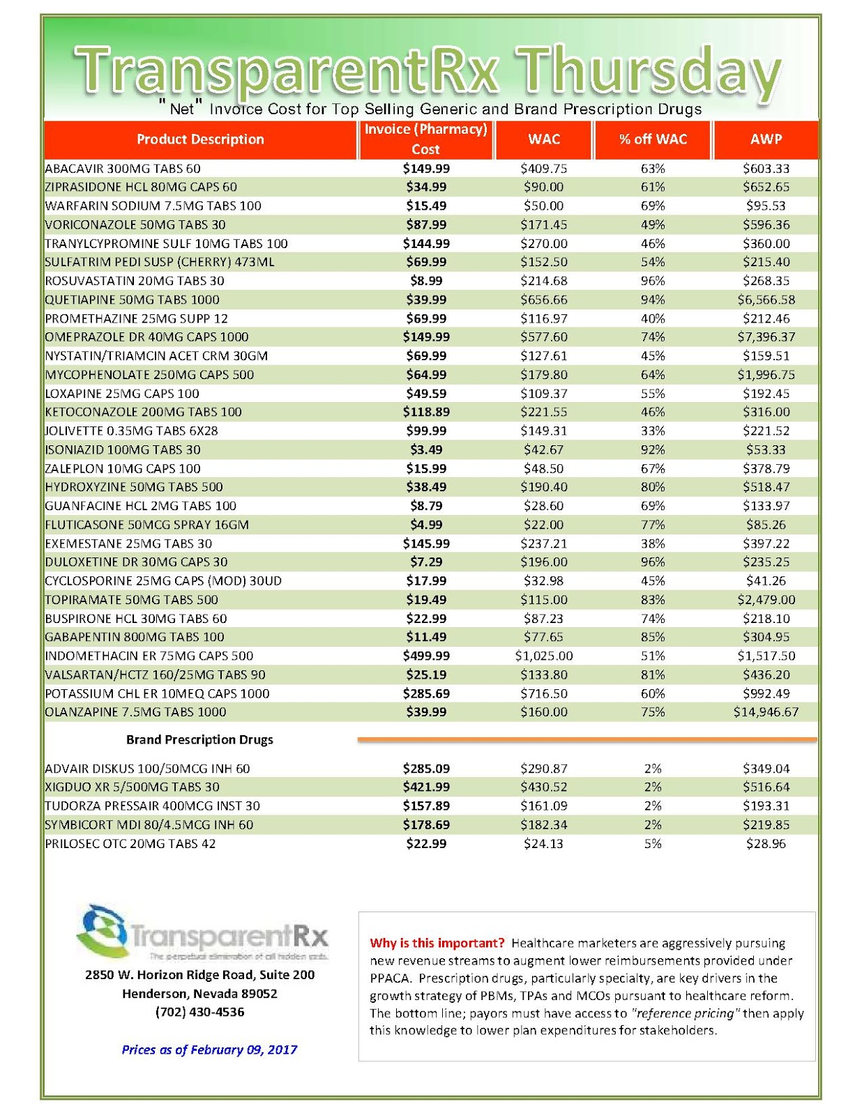 “Gross” Invoice Cost for Top Selling Generic and Brand Prescription Drugs – Volume 156
