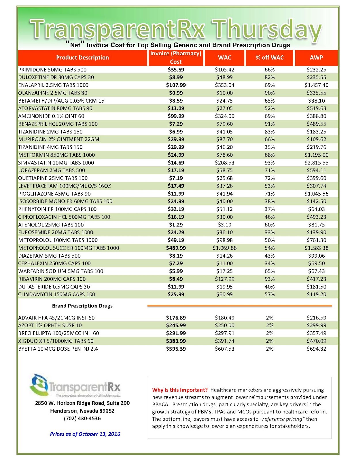 “Gross” Invoice Cost for Top Selling Generic and Brand Prescription Drugs – Volume 138