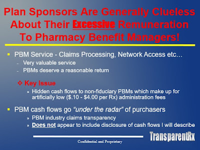 Tyrone’s comment: PBMs provide a valuable service and deserve a reasonable return but along the way non-fiduciary PBMs learned they could profit from unsophisticated purchasers who help generate excessive returns. I don’t put all the blame on non-fiduciary PBMs as some of it goes to the payers, and their representation, who permit such a lack of transparency. There is no question if the big three (ESI, Caremark and Optum) switched to a fiduciary model and changed nothing else net plan costs would go down significantly. The only problem is so would their market capitalization by half.