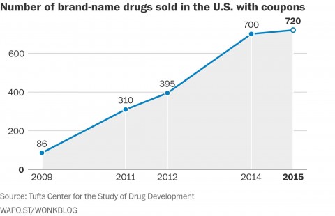 Couponing is on the rise. In a report released in May, the Boston-based Tufts Center for the Study of Drug Development said that there are copay coupons for over 700 medications now, up from about 75 in 2009. IMS Health found that 10% of prescriptions used a copay card in 2015, up from 3% in 2010.