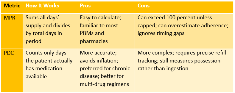 Because it’s impractical to observe directly whether every patient takes every pill, the industry relies on proxy metrics using refill/claims data. Two widely accepted measures are: